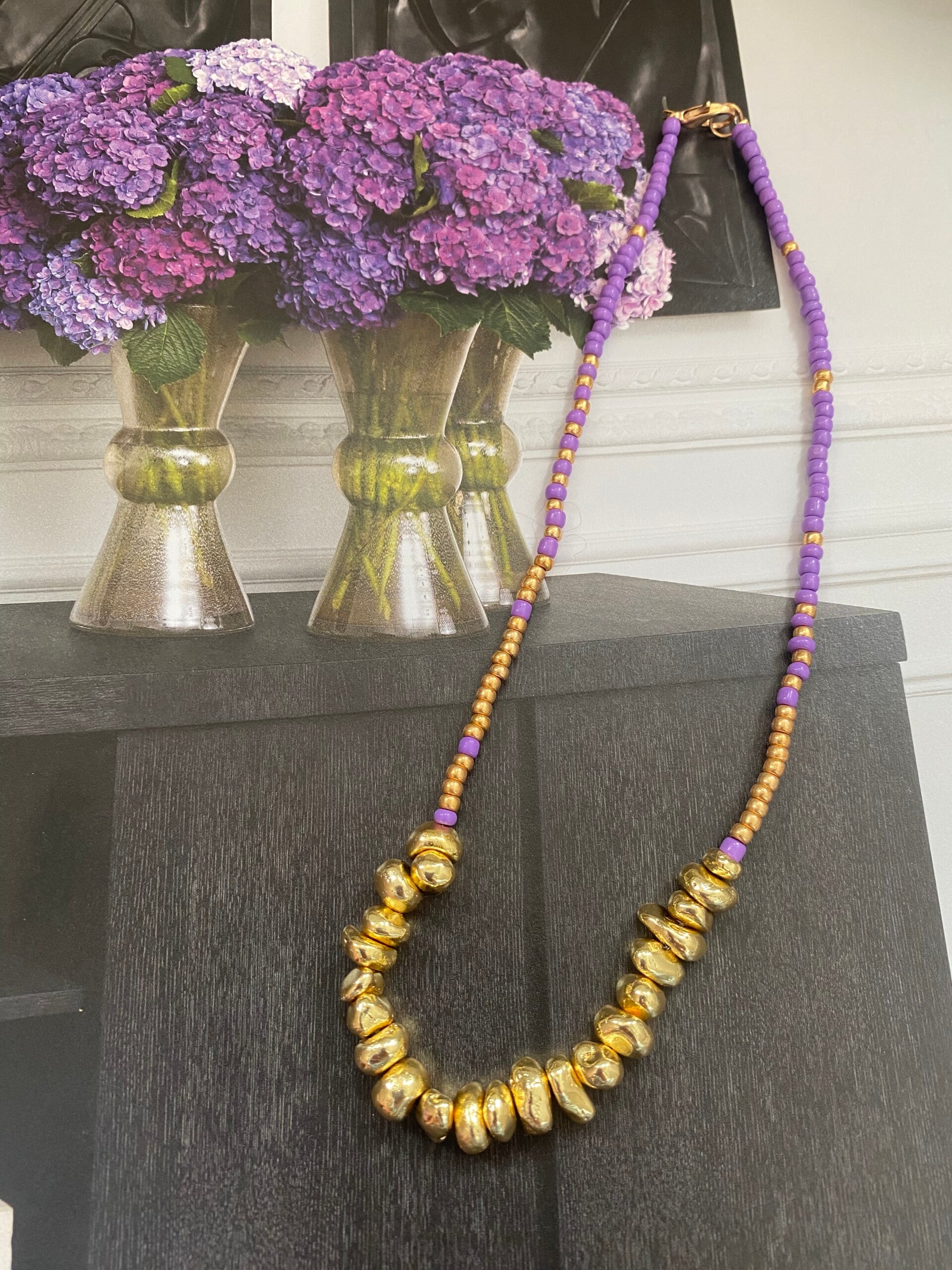 Een hals ketting uit de nieuwe collectie met als master piece in het midden goldplated gouden steen model kralen waardoor het een echte eye catcher op zich is.