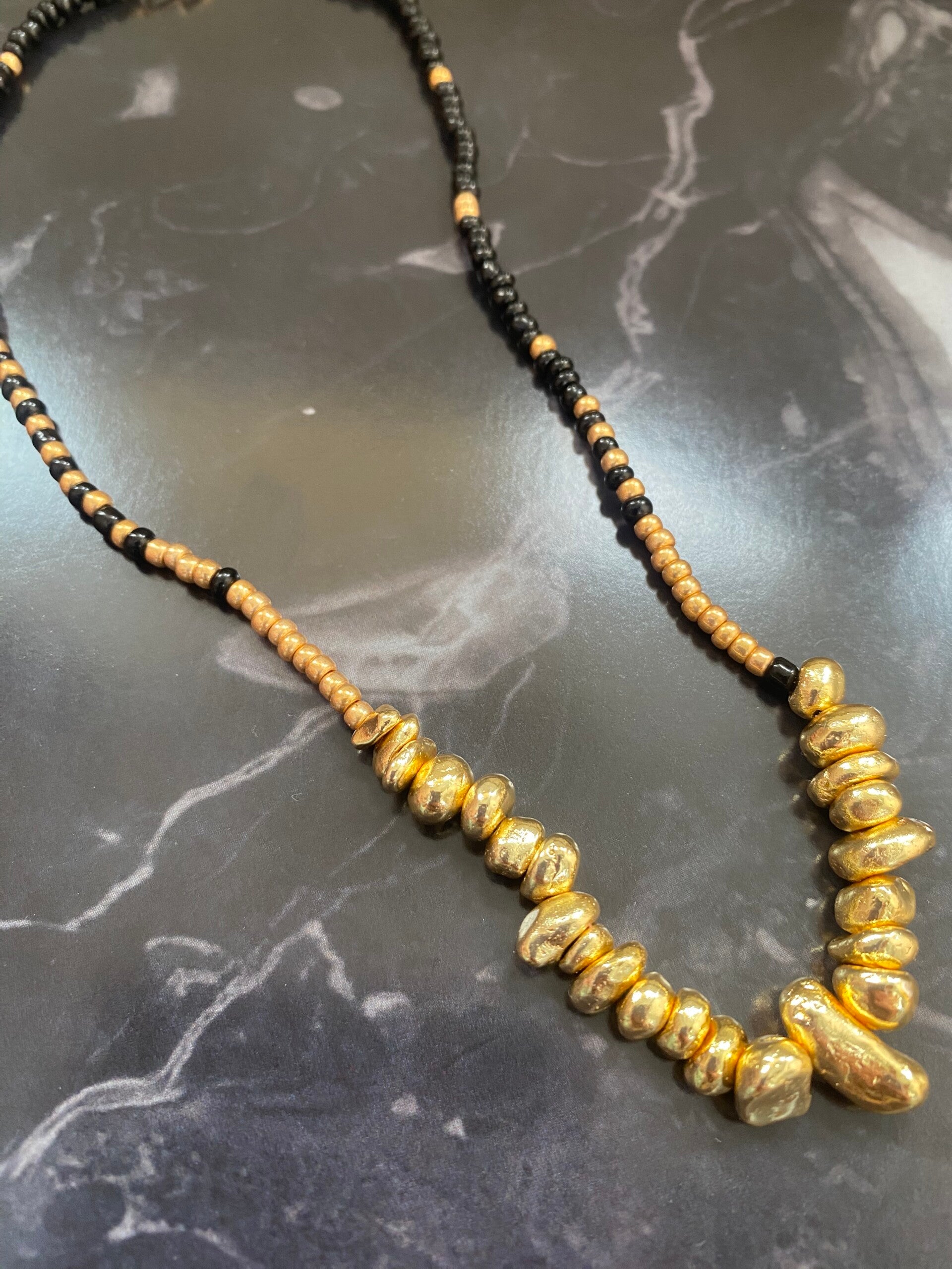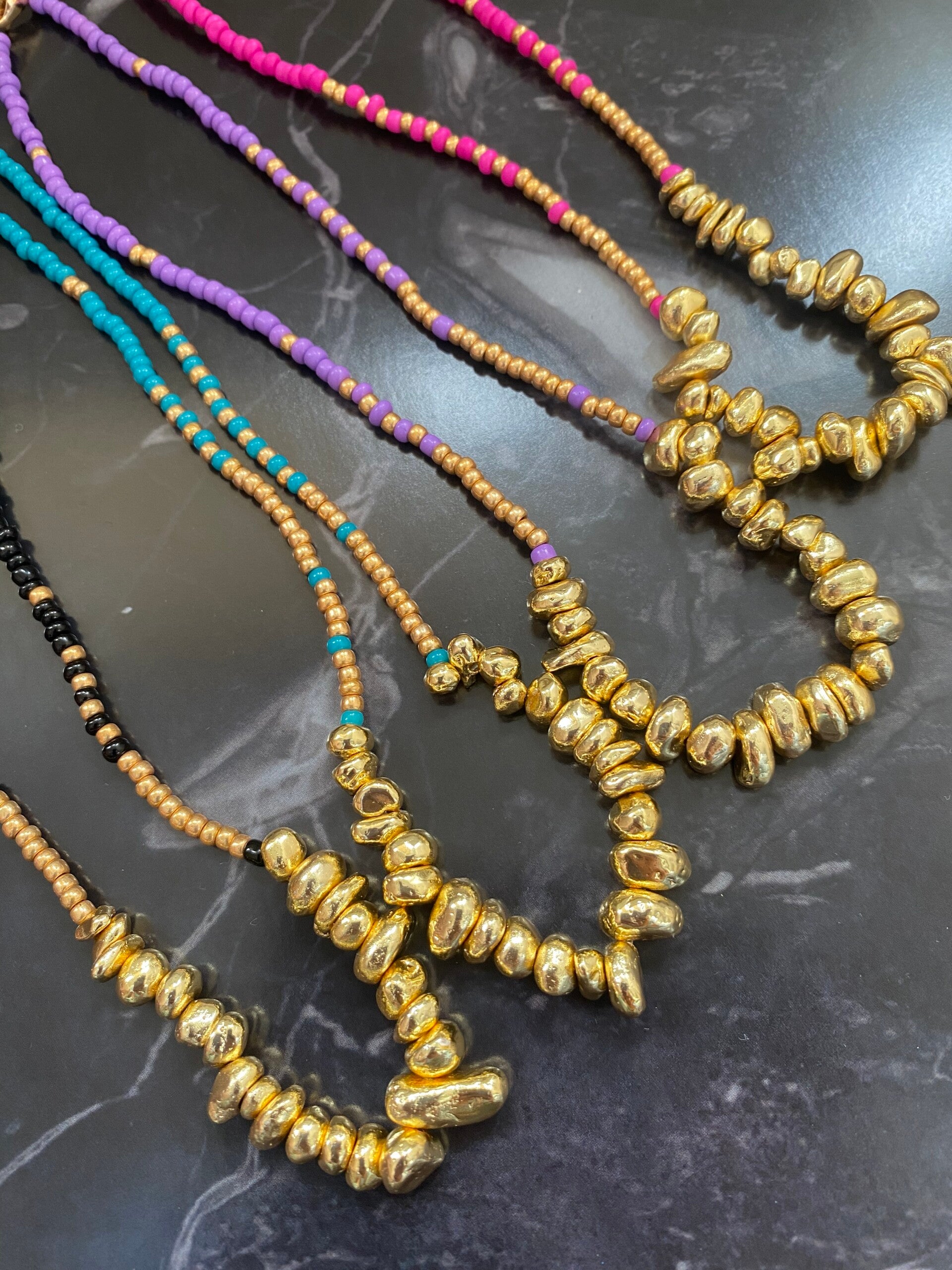 Een hals ketting uit de nieuwe collectie met als master piece in het midden goldplated gouden steen model kralen waardoor het een echte eye catcher op zich is.