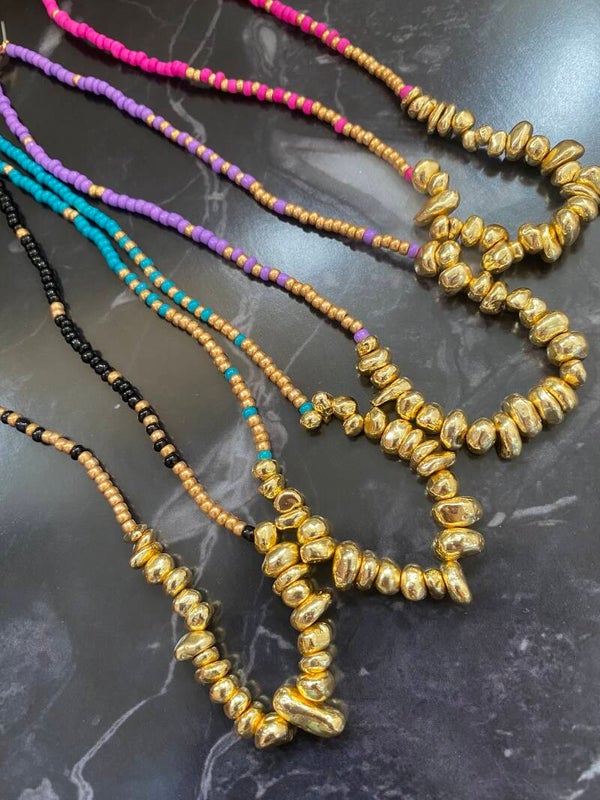 Een hals ketting uit de nieuwe collectie met als master piece in het midden goldplated gouden steen model kralen waardoor het een echte eye catcher op zich is.