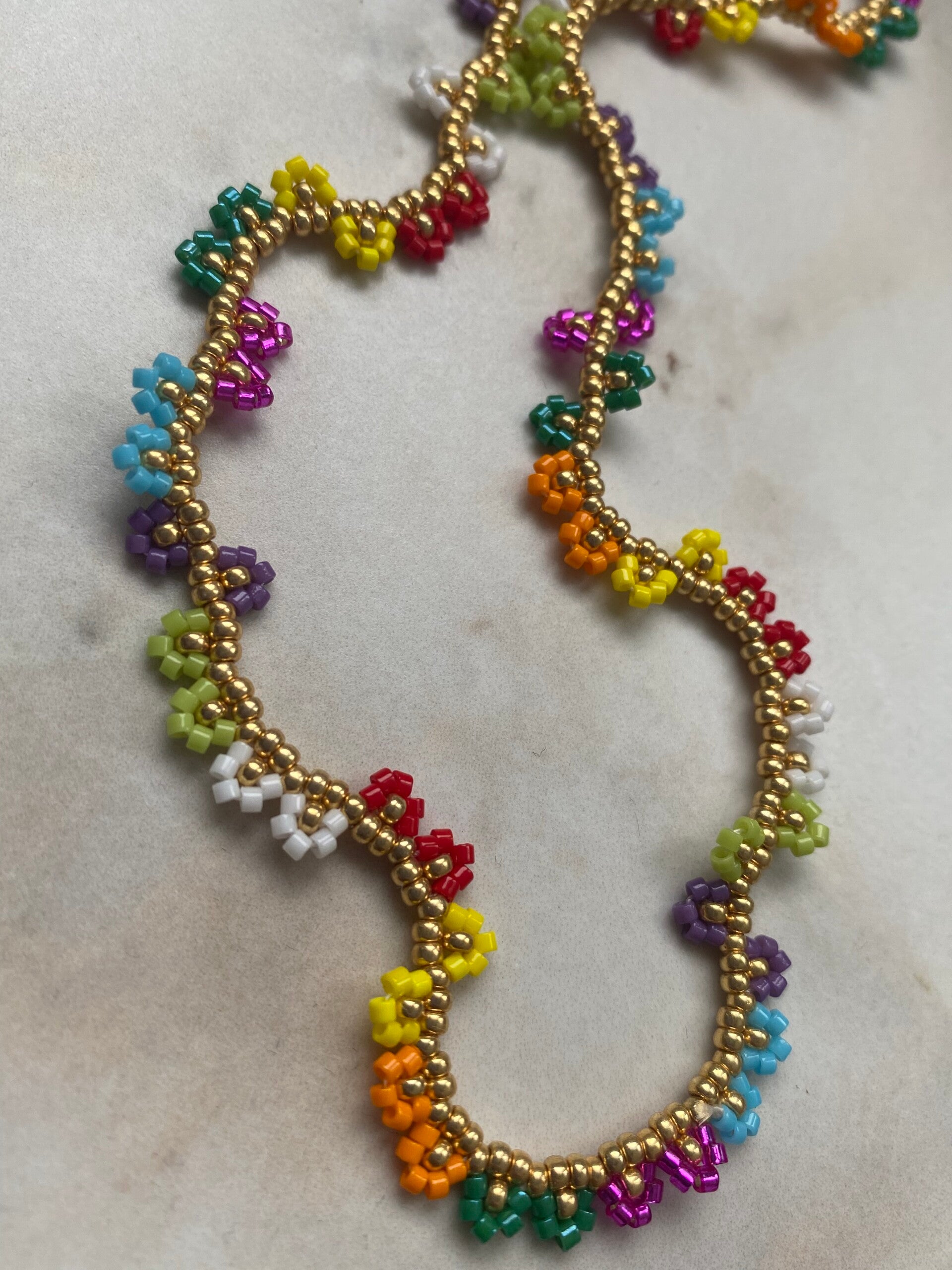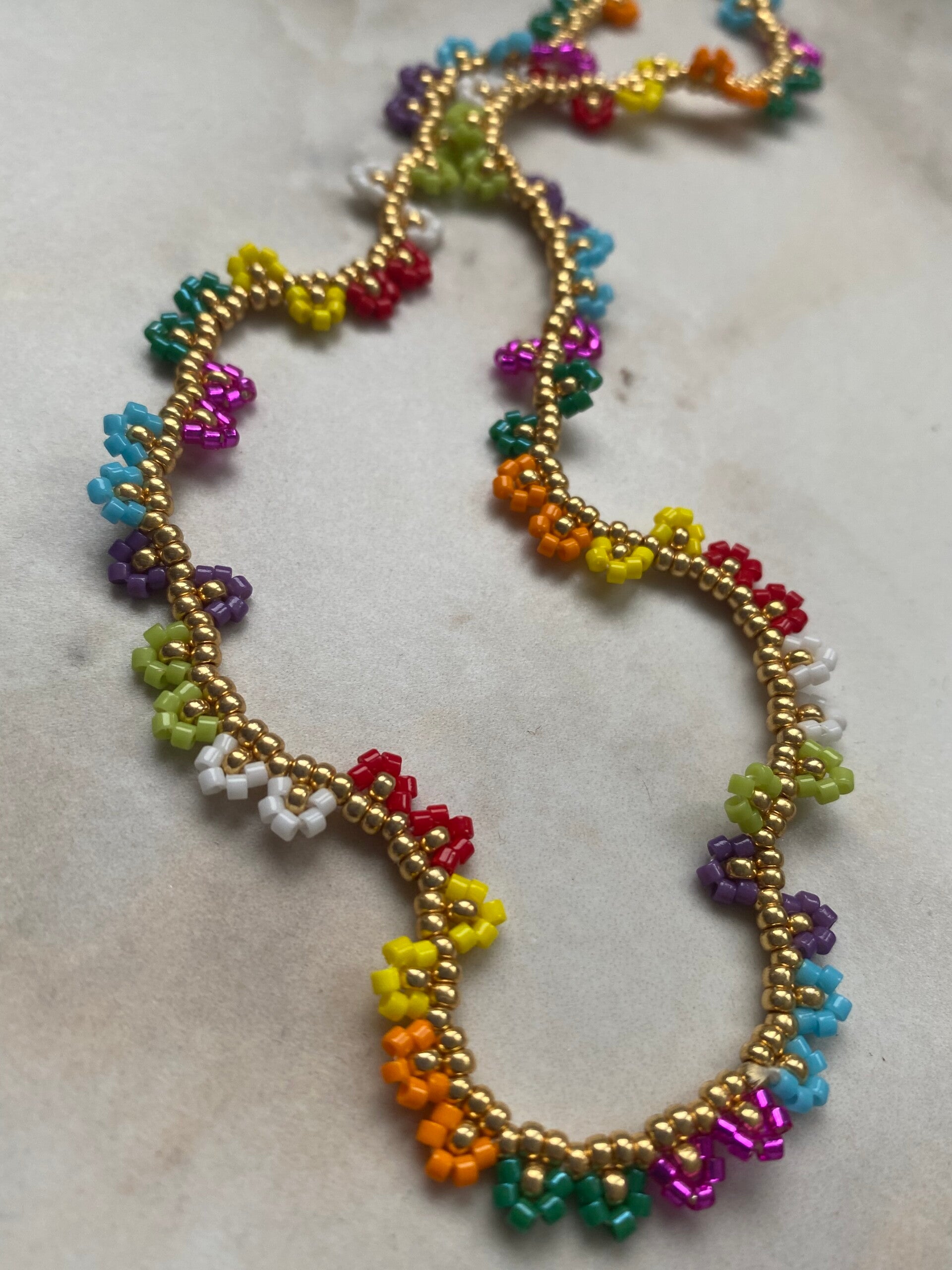 Deze ketting onderscheid zich zeker voornamelijk doordat alle bloemetjes met de hand gemaakt worden er zit letterlijk bloed zweet en veel draad en kralen in deze ketting!