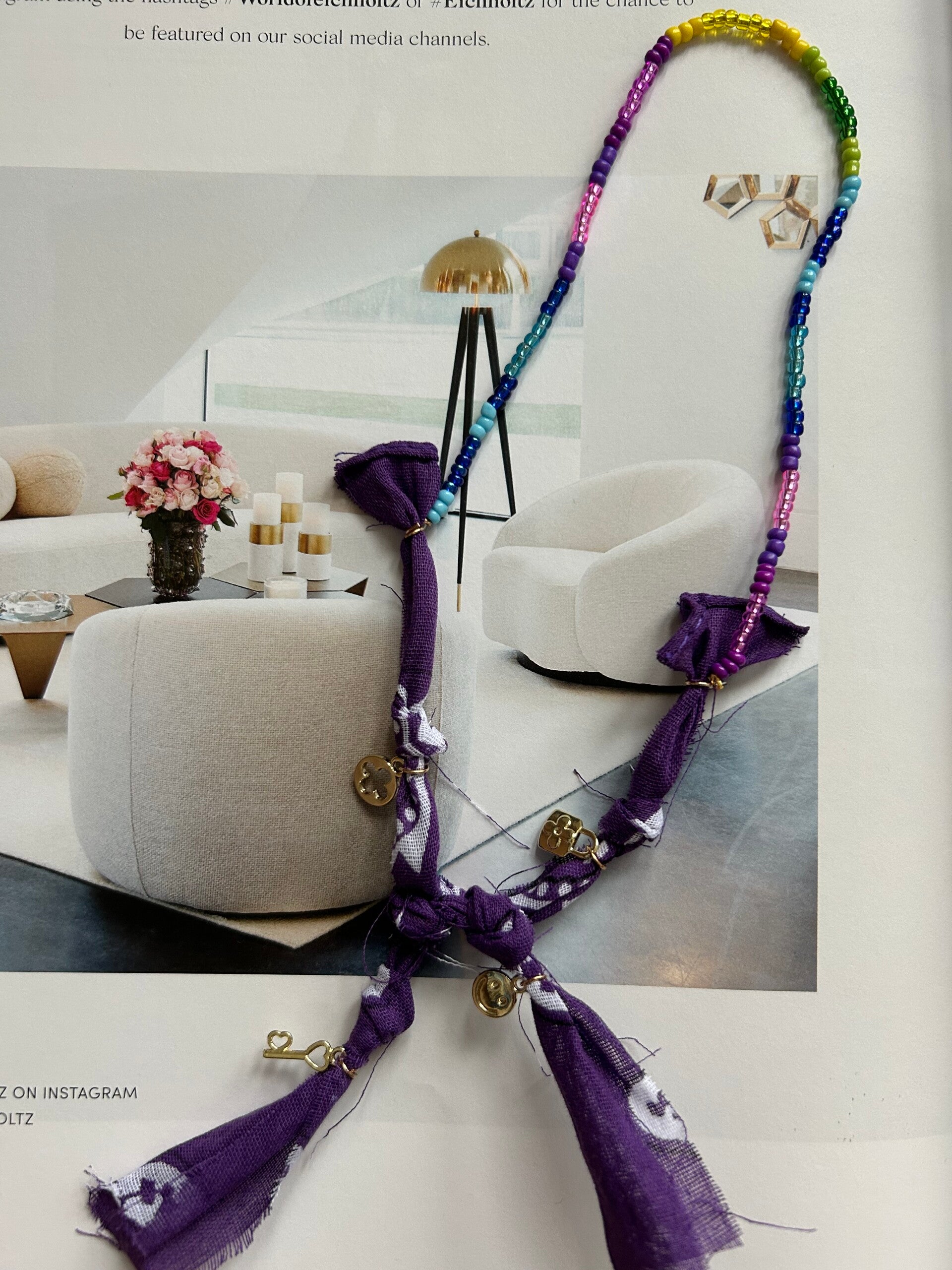 Dit is de Fiftyfifty ketting hij is gemaakt van half bandana en half kralen ketting.