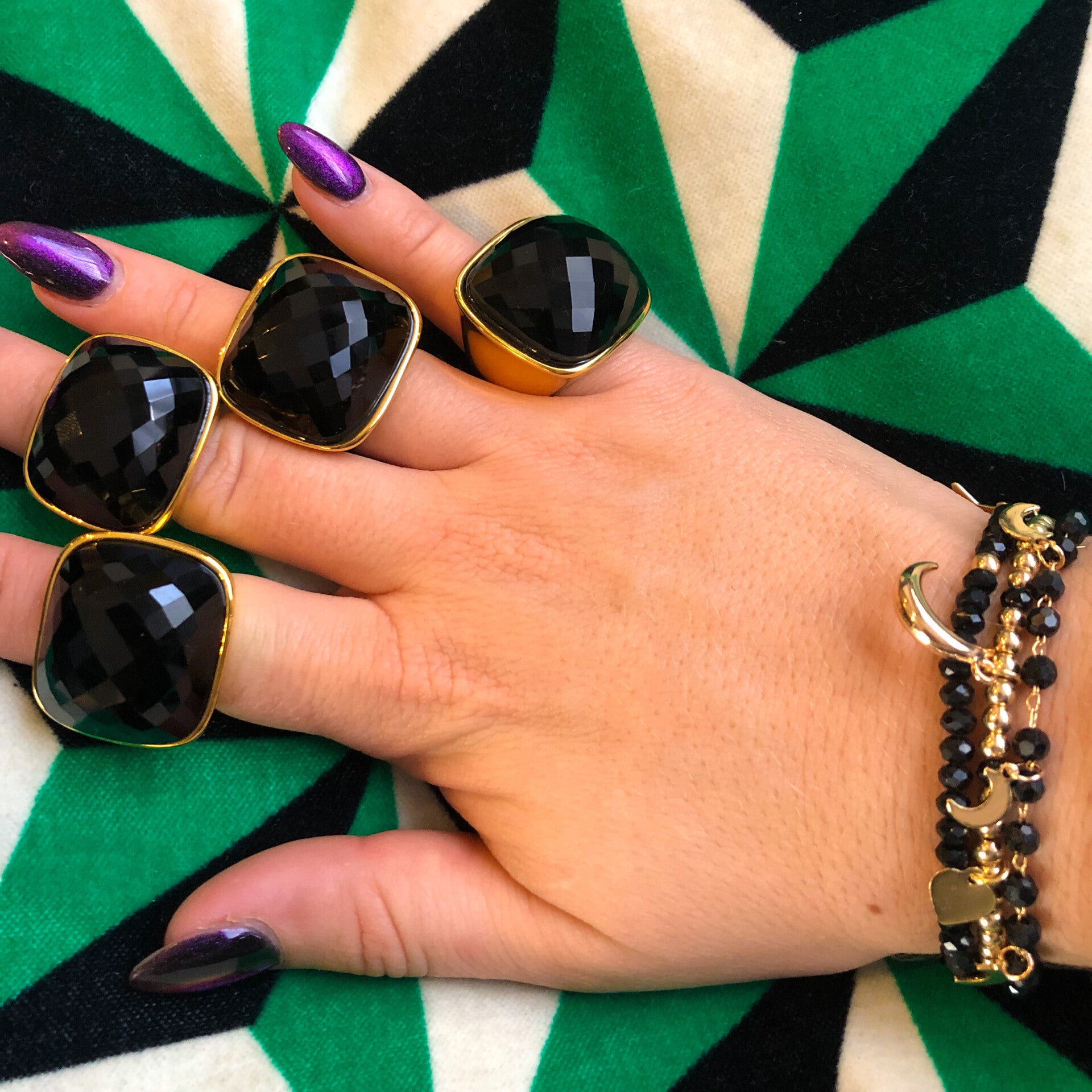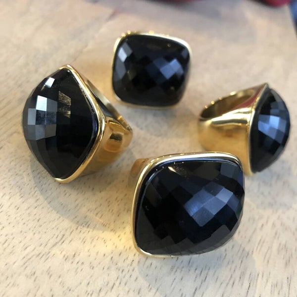 Goldplated goudkleurige ring met een zwarte steen! Leuk te combineren met andere items van onze collectie
